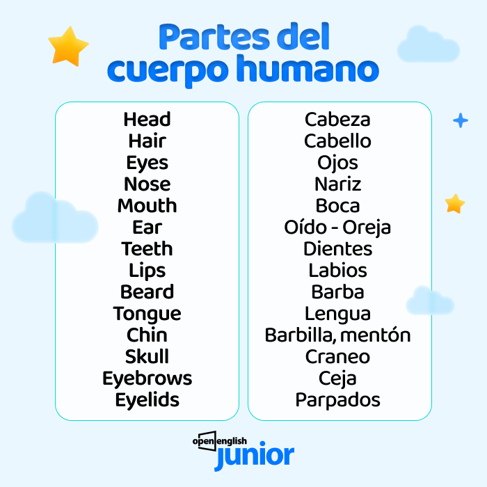 A continuación encontrarás una lista de las partes del cuerpo en inglés y español.